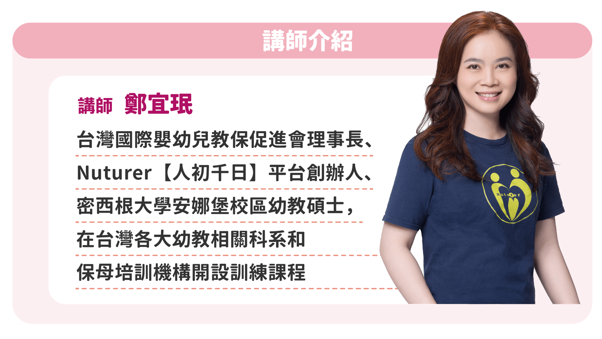 鄭宜珉,延伸聯合國「First 1000 Days」計畫,從生理到心理,全方位帶你打造孩子健康人生的黃金發展期。深耕嬰幼兒瑜伽、音樂、手語按摩超過15年,為家長開課,也為相關科系學生、在職保母開設專業人員訓練課程,包括【人初千日】、寶寶音樂手語、嬰幼兒按摩、嬰幼兒動能知覺瑜伽、寶寶副食品和親子共食、寶寶親水游泳、孕產按摩。邀請你進入「人初千日1|認識寶寶的第一個1000天」線上課程,為自己、為家庭、為孩子,預備健康、幸福的人生。