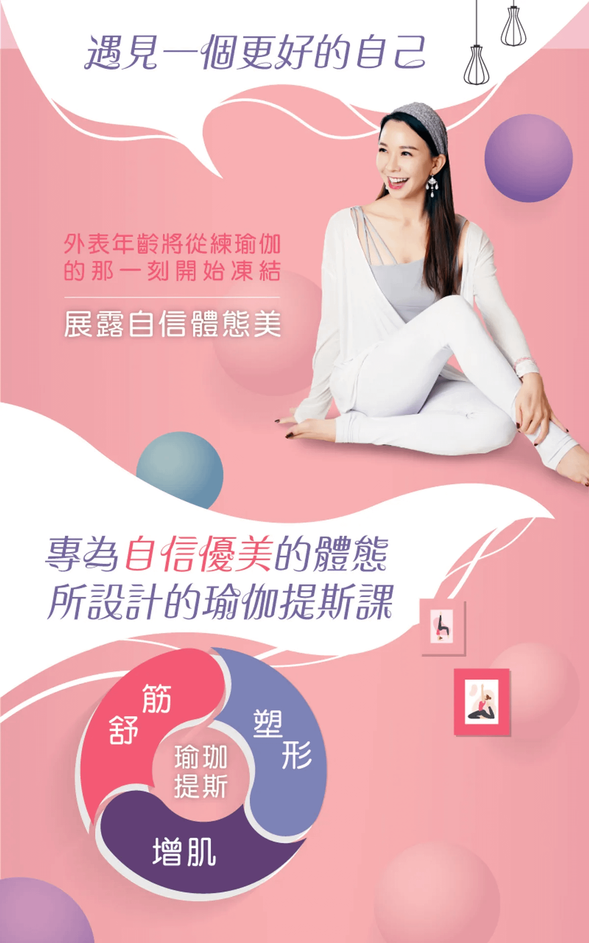 結合瑜伽的肌肉拉伸與皮拉提斯的核心訓練,讓身體更穩定,也可以增進柔軟度、放鬆關節和肌肉放鬆,讓體態身型更為勻稱修長,同時完成身體機能修護與放鬆、健身與美體雕塑等效果。