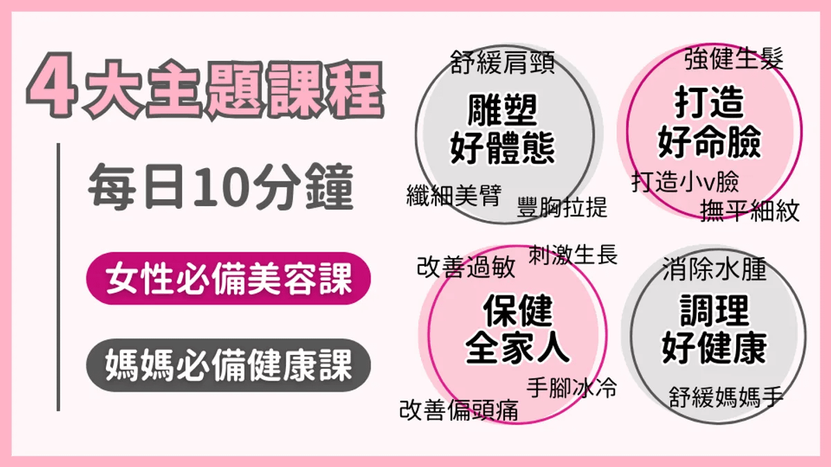 專家陪練的線上課程,搭配4大主題提供刮按技巧+經絡疏通棒手把手教學, 每天只要10分鐘,全家都適用🥰解決身體各種小困擾!