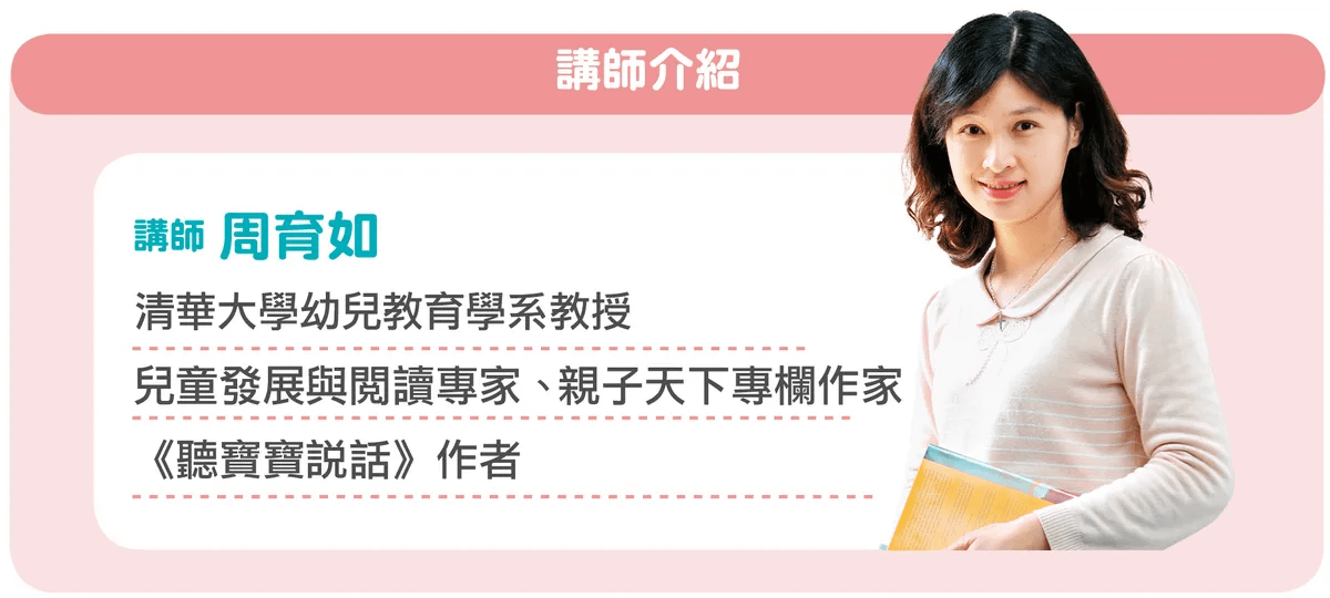 講師周育如,清華大學幼教系教授,曾任中央大學學習與教學研究所研究員、《兒童生命教育專刊》主編、親子天下專欄作家,著作《聽寶寶說話》已在台灣和大陸出版。她的研究領域為兒童心智認知、親子共讀、親子言談分析、發展心理學、讀寫發展等,同時也從事許多親職推廣的工作。