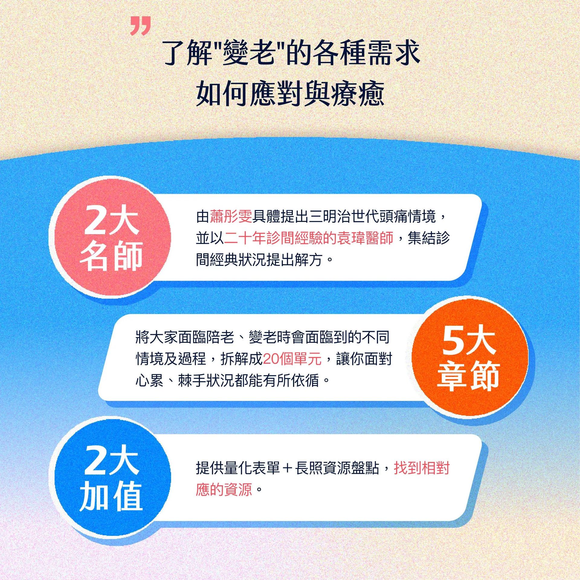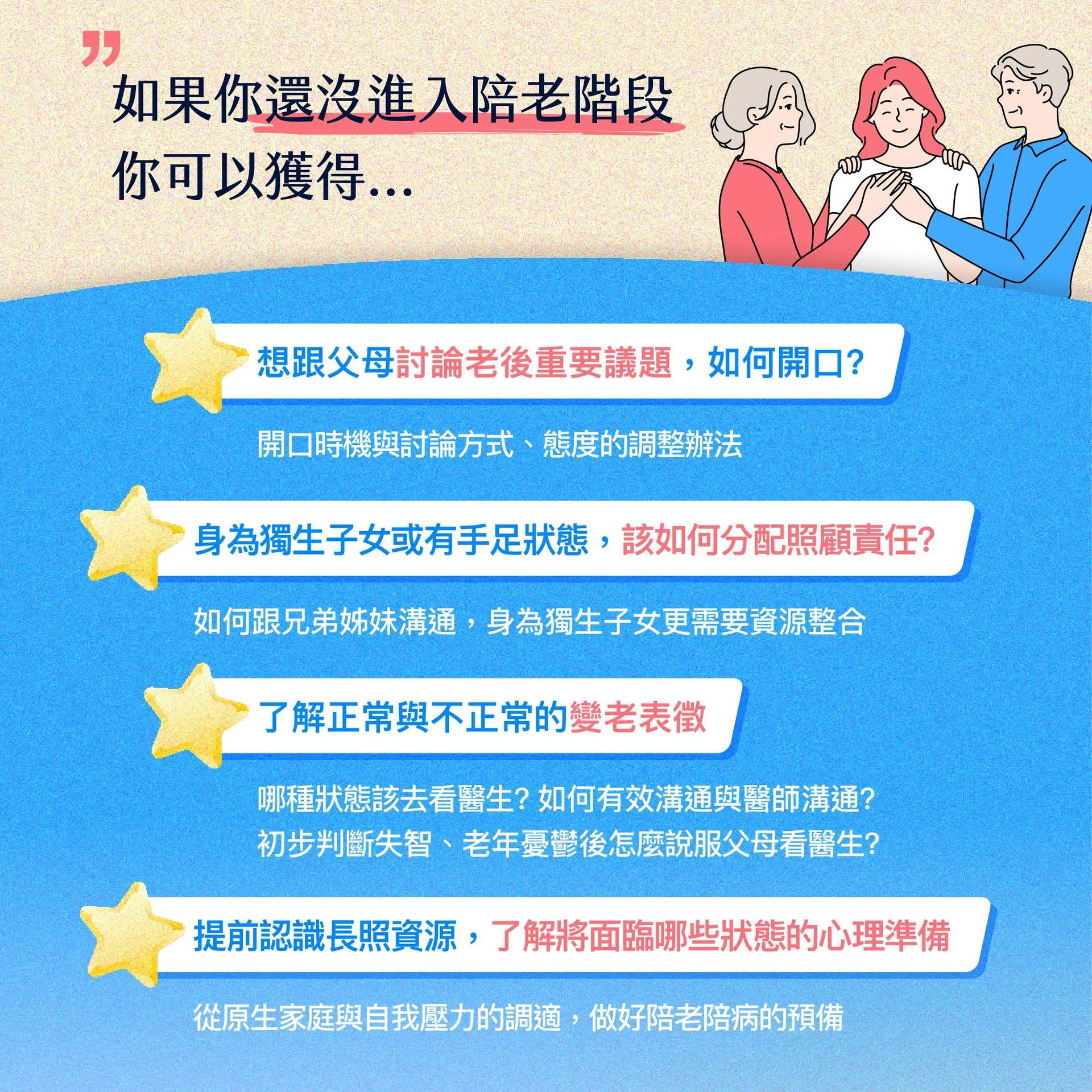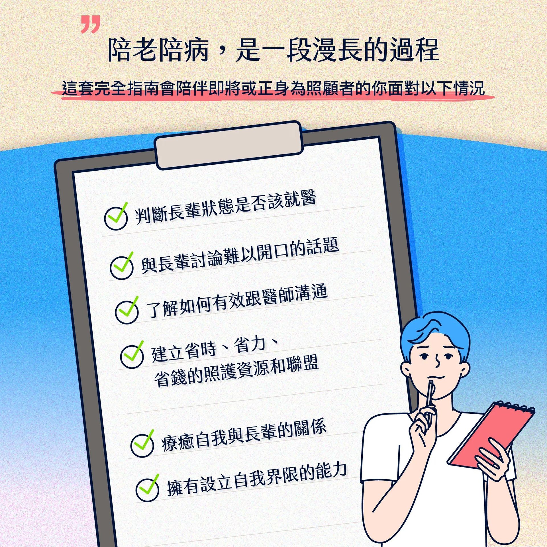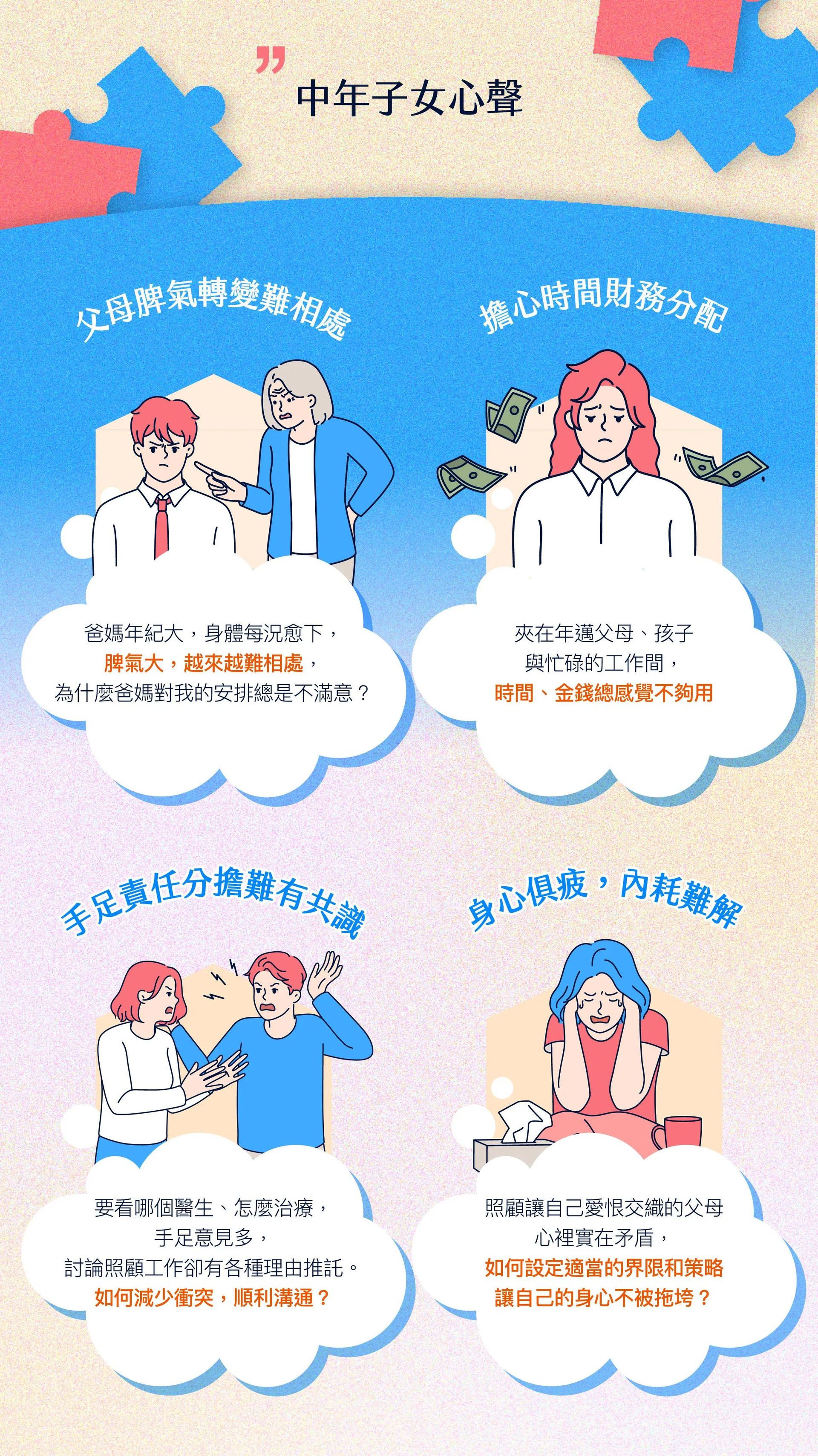 當父母身體漸漸衰弱,你看見了未來可能會面對的照顧問題,或已經到了需要被照顧的狀況,陪老、陪病,變成每天睜開眼就要面對的壓力。