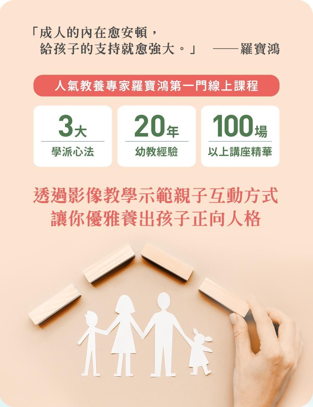 現在羅寶鴻老師開設線上課程了,真是令人振奮的好消息!羅寶鴻的安定教養課,不僅幫助家長理解、處理小孩的各種情緒,在面對教養挑戰時,也能從容不迫,因應自如,不僅安定小孩的心,也安定家長的心,讓我們懷抱著對孩子的愛,與孩子一同茁壯成長吧:)