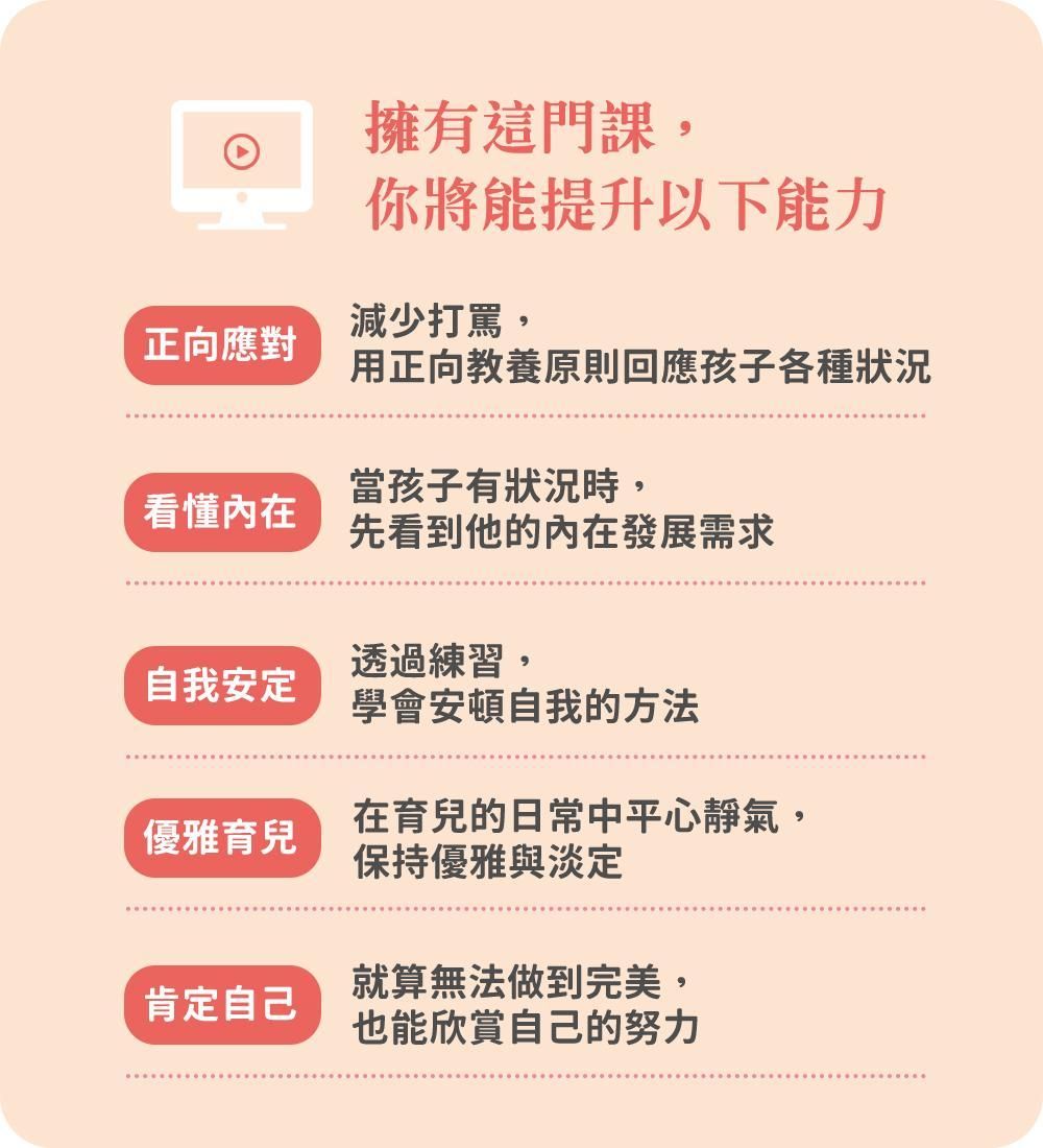 愛孩子,就應該要在衝突下的教養,讓他們感受到我們的愛。寶鴻老師的線上課程,跳脫文字的約束,用穩定且磁性的聲線,示範在每個實際的親子狀況下如何去應對,讓在親子路上焦慮不安的你,獲得安定。