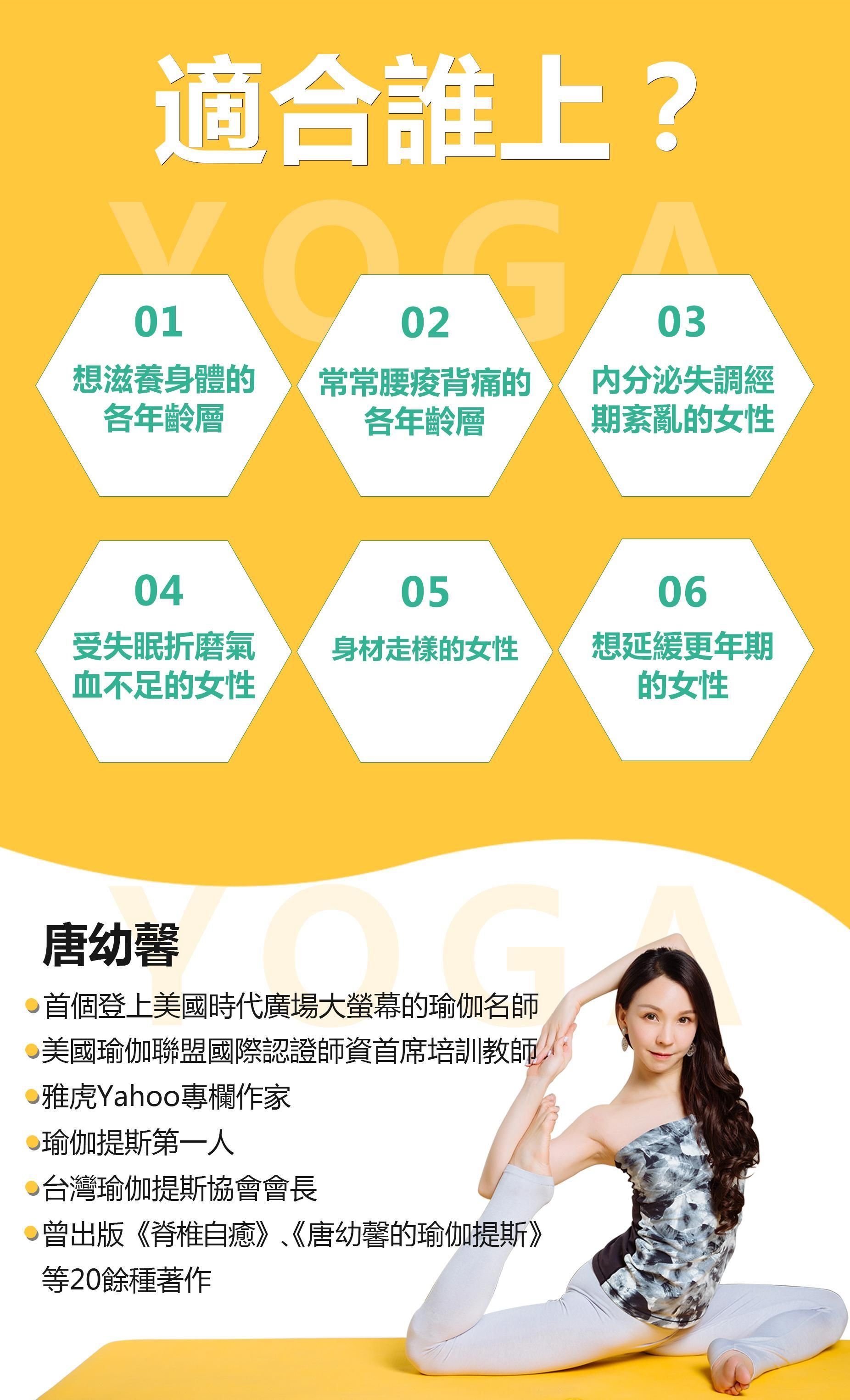 只有從內到外的抗老,才能實現真正的減齡,小S、林志玲、曾馨瑩欽點的瑜伽老師唐幼馨,教你明星都推崇的瑜伽提斯,幫你實現從內到外的減齡!