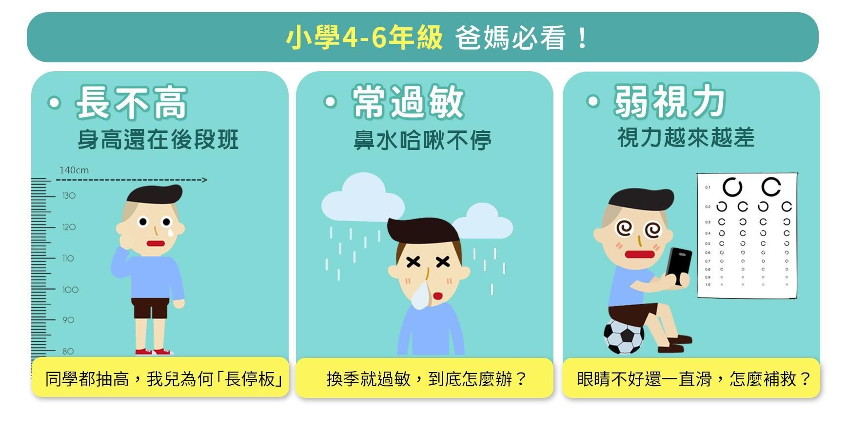 一、必須馬上看:家有小學4-6年級孩子(女孩10-14歲或初經後、男孩11-15歲)。目前已有比同學平均身高矮、常過敏及視力越來越差的狀況。