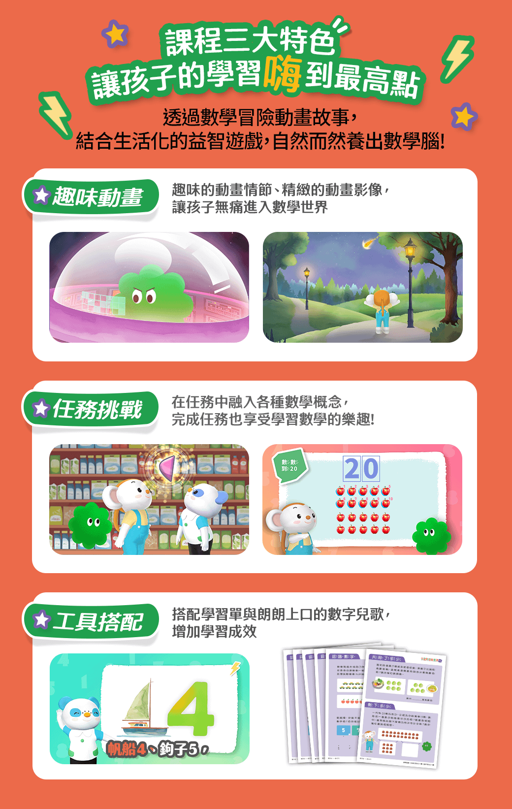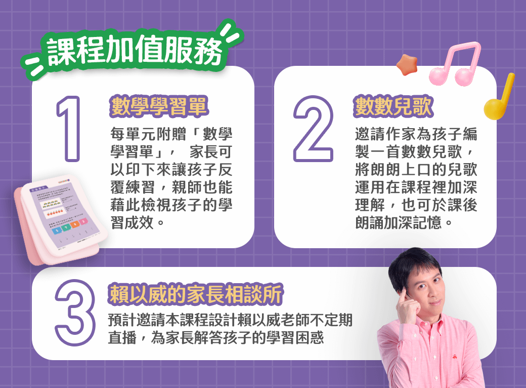 隨課堂附贈加值學習素材:隨課程贈送由專業數學幼教教師設計的課後學習單,以及朗朗上口的數學歌謠,讓家長立即收穫孩子的學習成效。