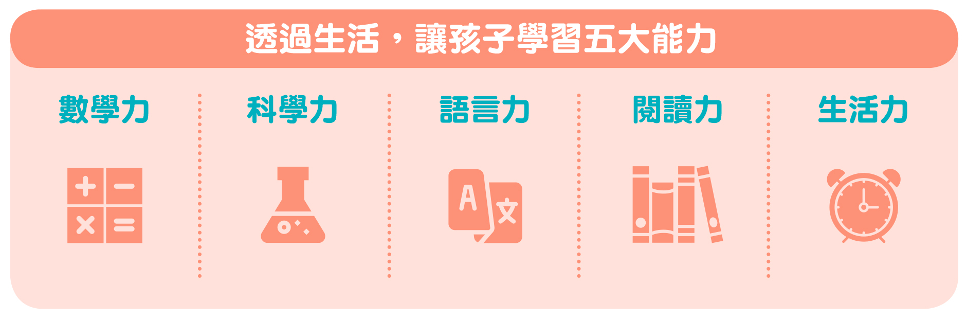 從日常生活中隨手可得的器具和生活中的小活動,一起帶著孩子從生活中學習數學力、科學力、語言力、閱讀力與生活五大能力。邀請你加入這個課程,讓李坤珊老師陪伴你一起了解示範簡單的做法,幫助孩子從生活中學習和成長!