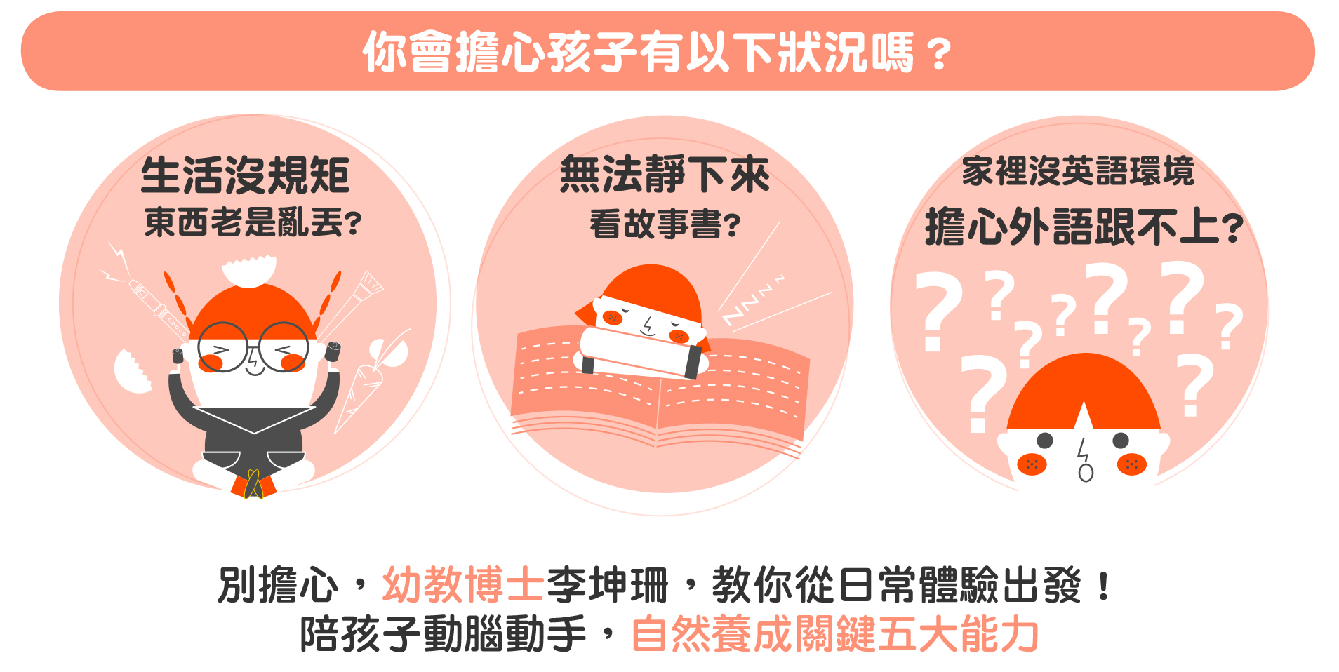 別擔心,幼教博士李坤珊老師要帶你「從生活中出發,輕鬆培養幼兒實用的五大能力」,相信只要方法用對了,孩子將因你的投入而不一樣。