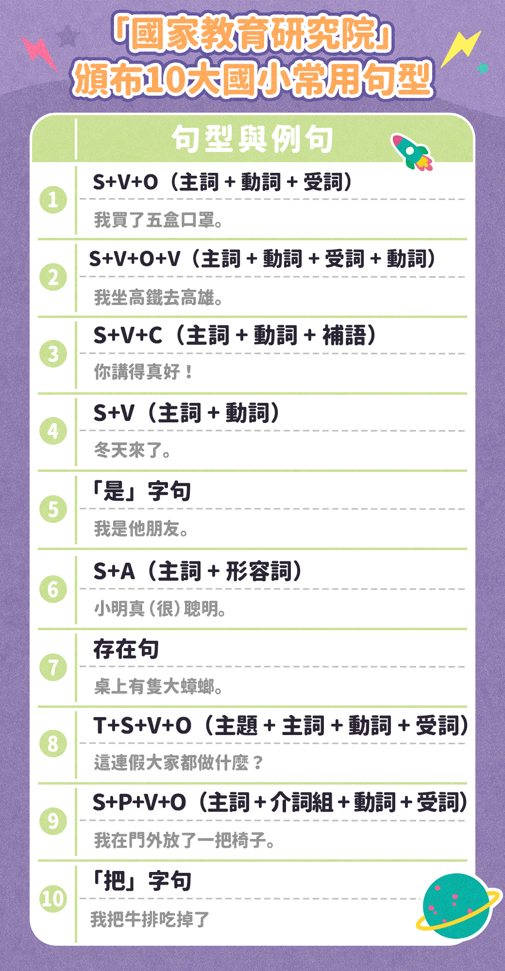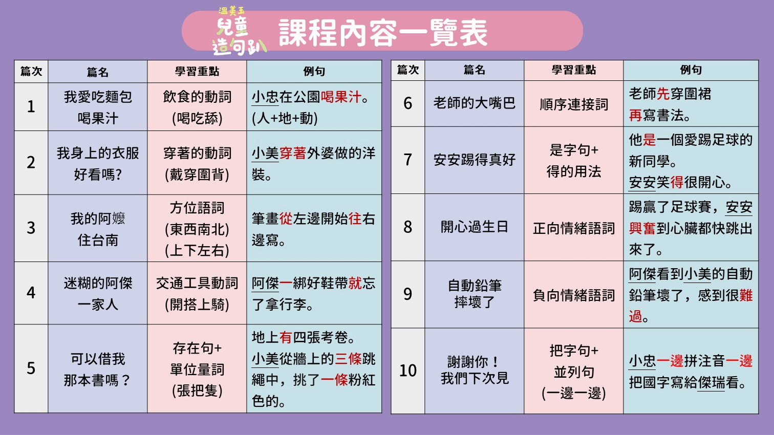 國家教育研究院曾整理出10大國小課本常用句型,本課程的10個單元中,將會透過有趣且具有教育意義的劇情,示範並帶領孩子練習這10大句型,讓孩子輕鬆掌握!