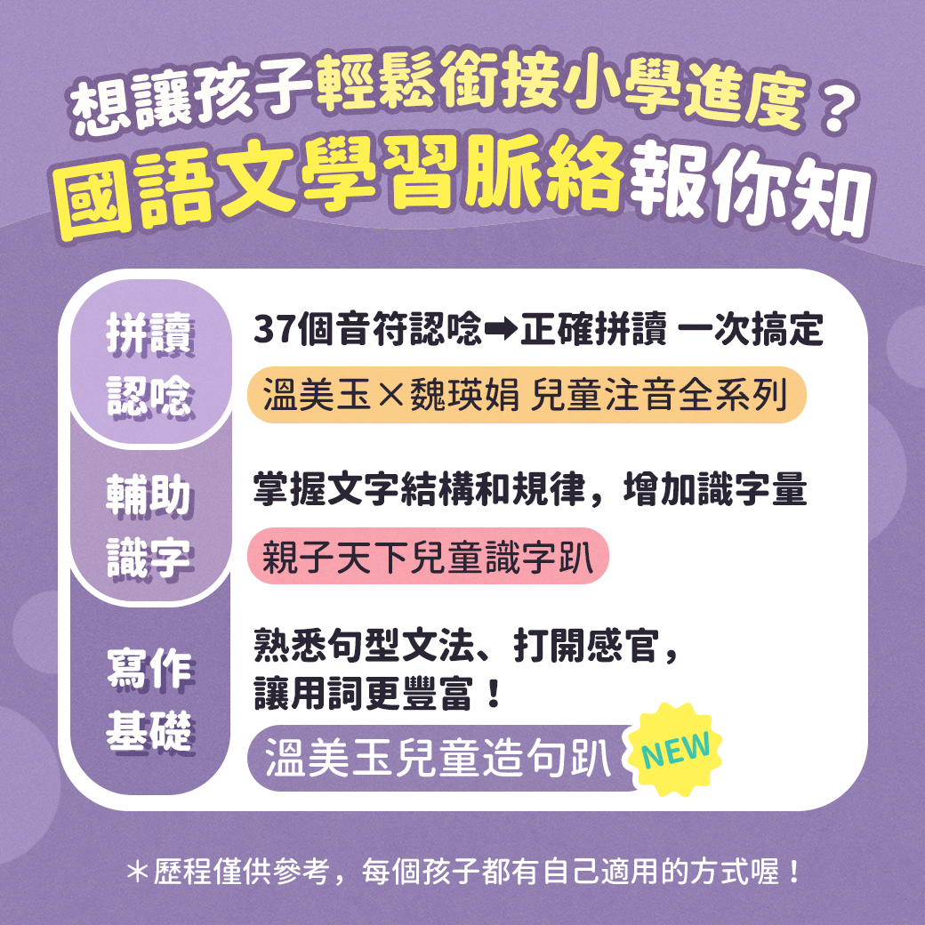 孩子學過很多詞彙與句型,但不用就記不住?沒想法就寫不出來?別擔心,試著讓孩子接觸《溫美玉兒童造句趴》,從動畫中,讓孩子輕鬆培養造句基本功。