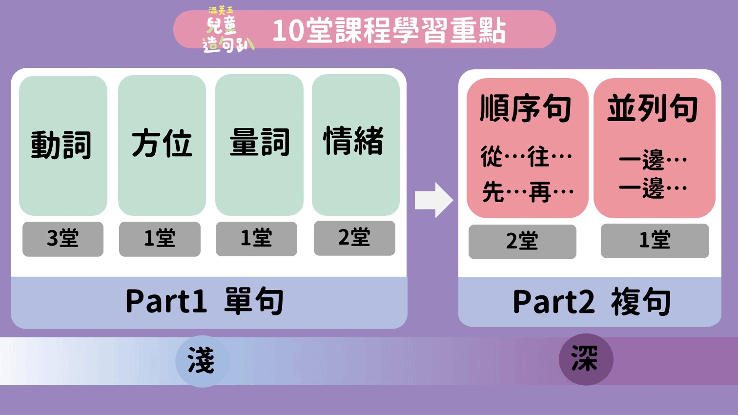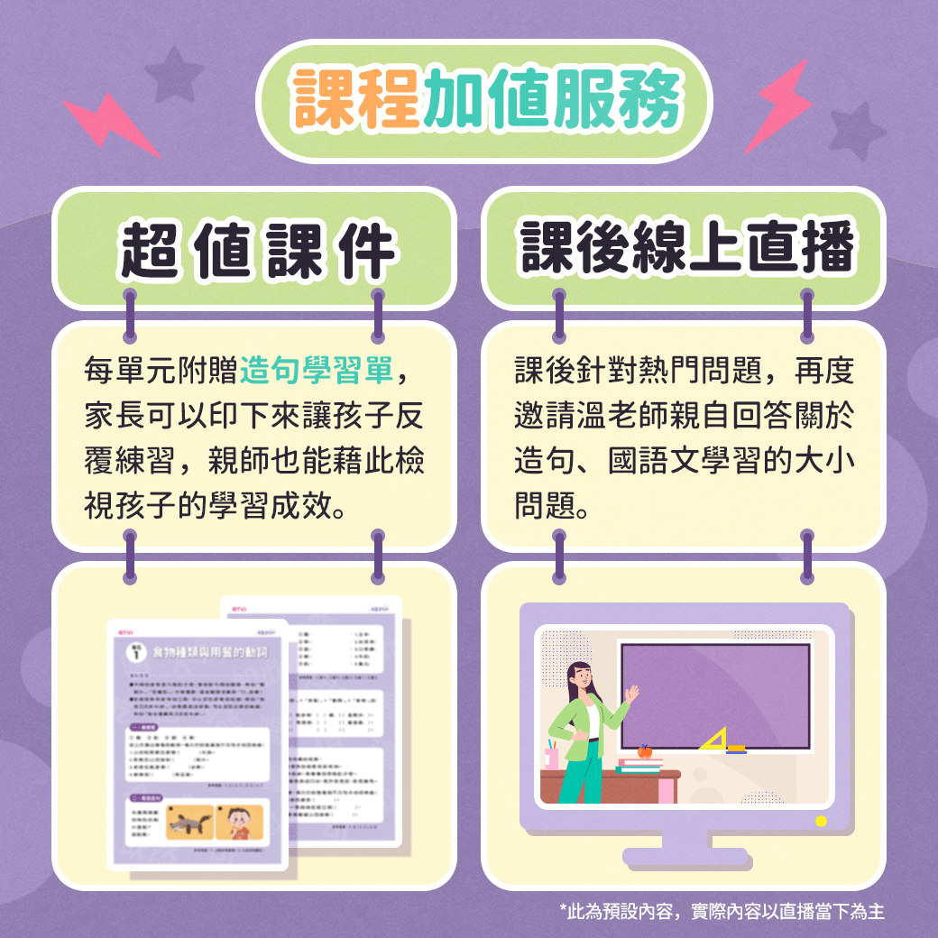 備註:造句學習單將隨單元上架時一併提供於課件中;課後線上直播可於課程內容中的「加值服務」回放。
