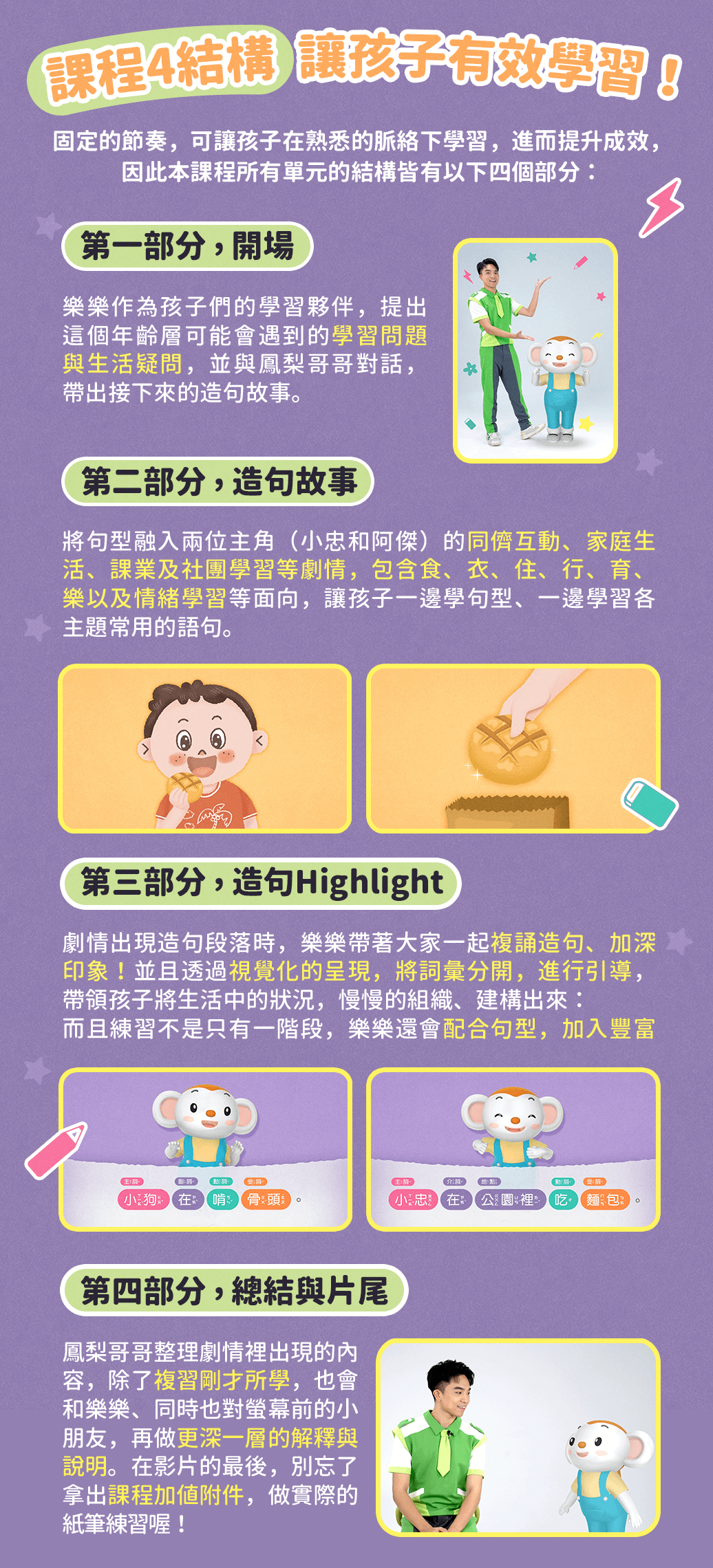 本課程由「樂樂」陪著小朋友一起學造句,他會跟在兒童台擁有高人氣的鳳梨哥哥問答、對話、總結,鳳梨哥哥也會適時解釋、加深學習內容,並提醒孩子可以拿出學習單複習,建立孩子的學習習慣,也讓孩子的學習輕鬆自在卻不失深度。
