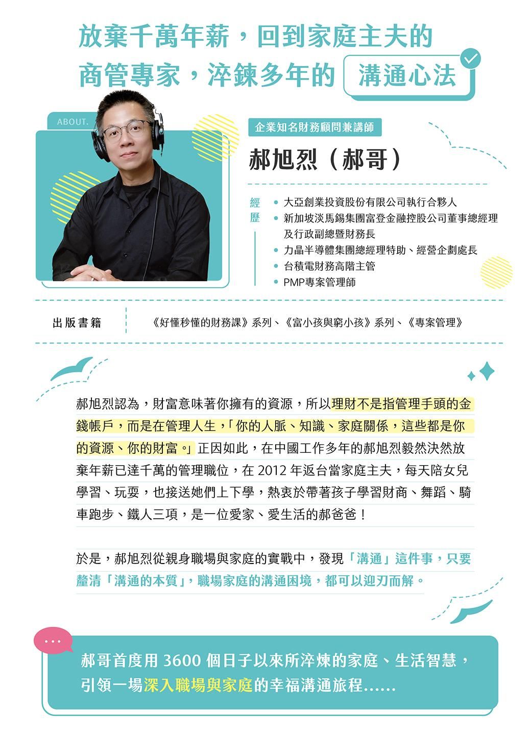 曾在台積電擔任財務高階主管,擁有超過30年的商場智慧的郝旭烈(郝哥),10年前棄千萬年薪,找回職場、家庭與健康兼顧的甜蜜點。這次,他首度淬煉3600個日子以來的家庭、生活智慧,引領我們踏入一場職場與家庭都受用的幸福溝通旅程。