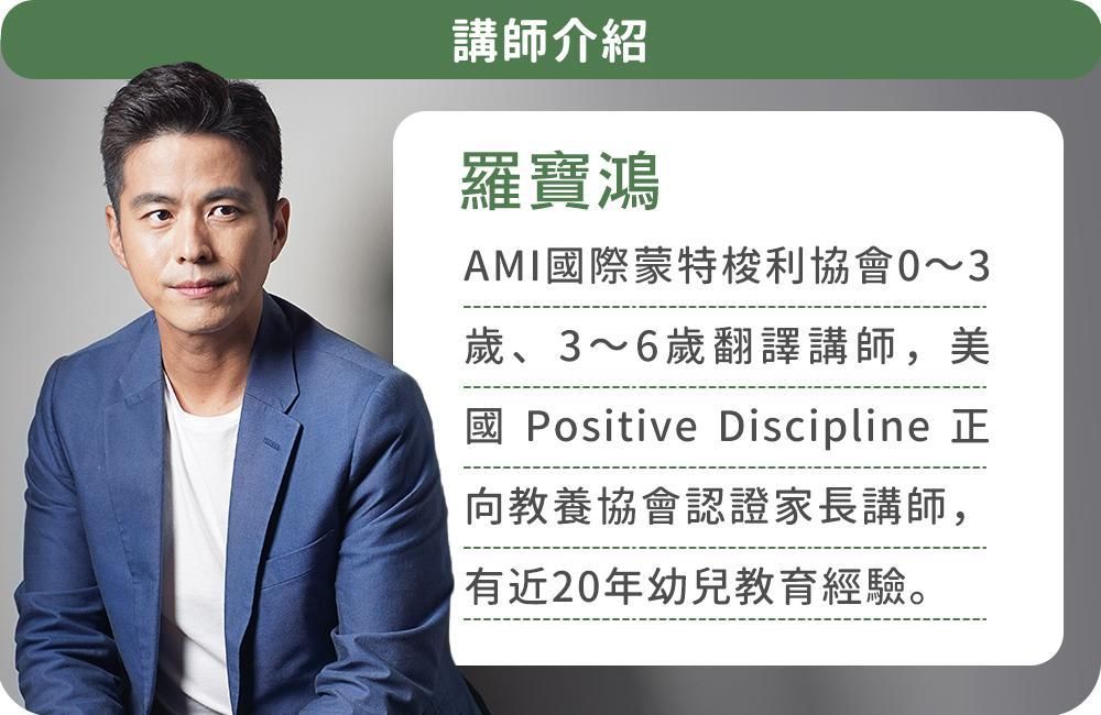 本課程講師羅寶鴻,一個七歲男孩的爸爸,從不把育兒工作全託付給太太的他,透過陪伴孩子的親身經驗,不但印證了蒙特梭利教養理論的深奧,更將阿德勒正向教養與薩提爾模式融入他的日常。