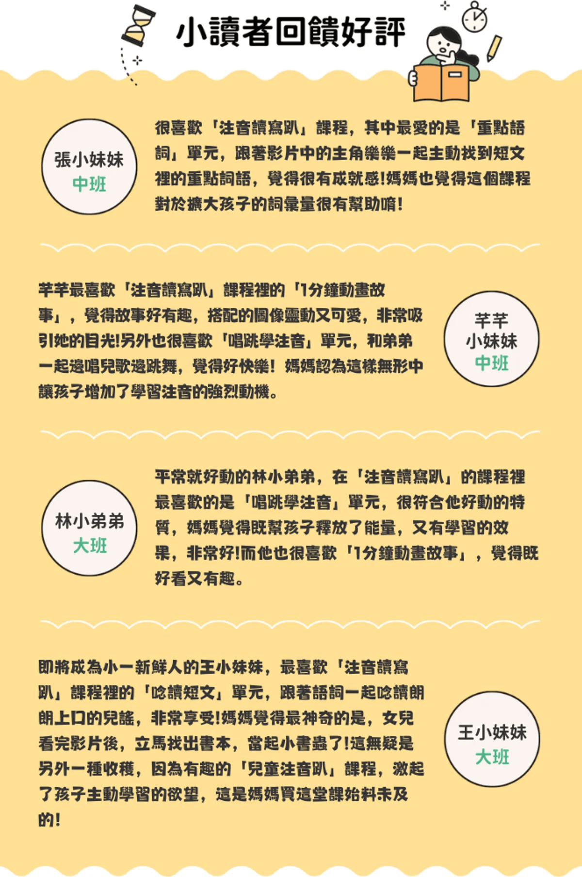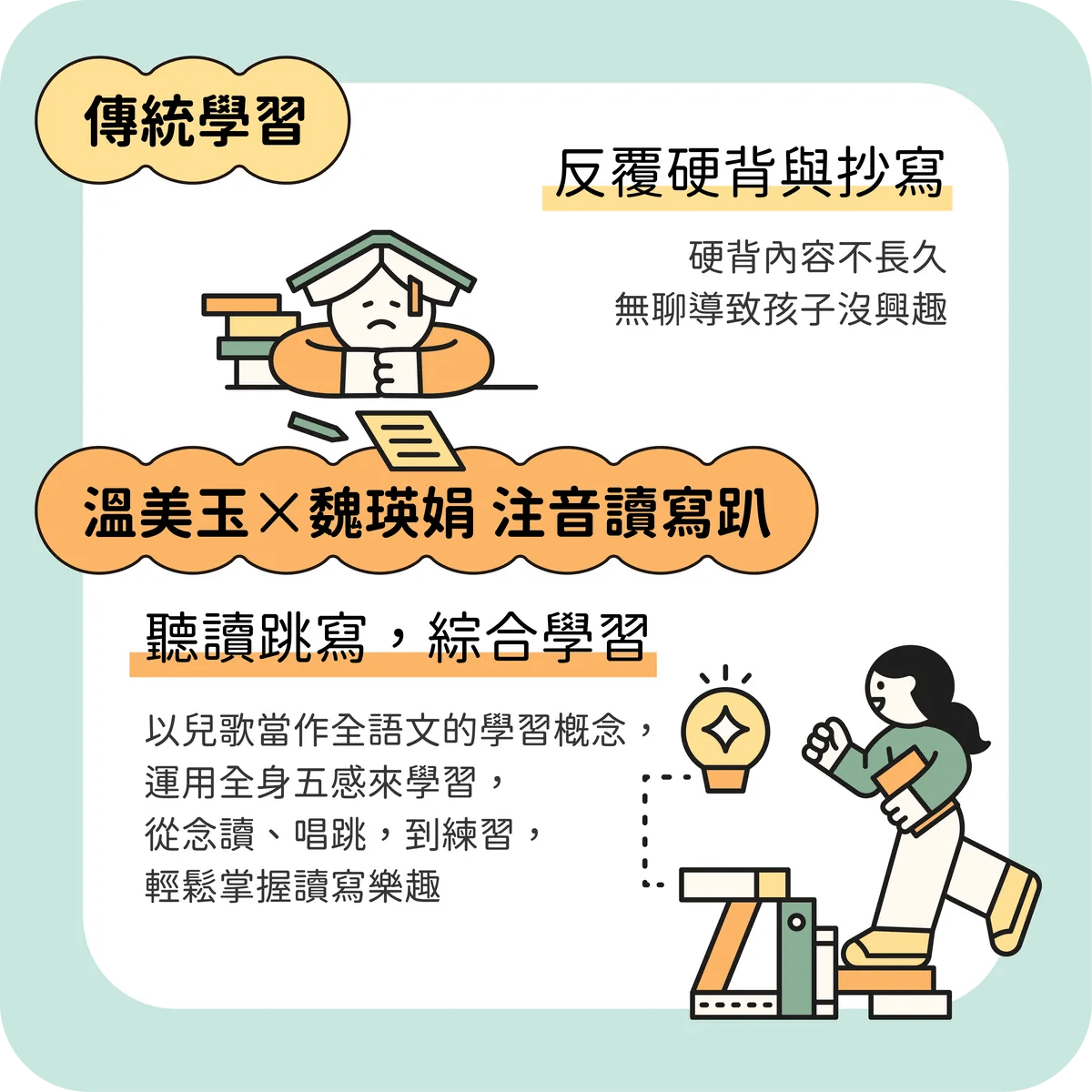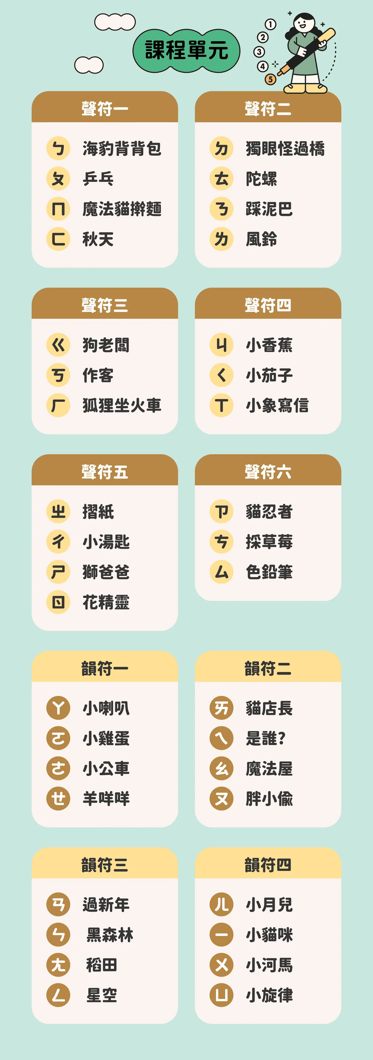 從聽一分鐘的兒歌故事→唸謠學習重點語詞→唱跳注音兒歌到最後的讀寫語文遊戲,完成從語言學習(注音符號)過渡到閱讀(文學)的橋梁,最終進入獨立閱讀,順利銜接小學的語文課程。