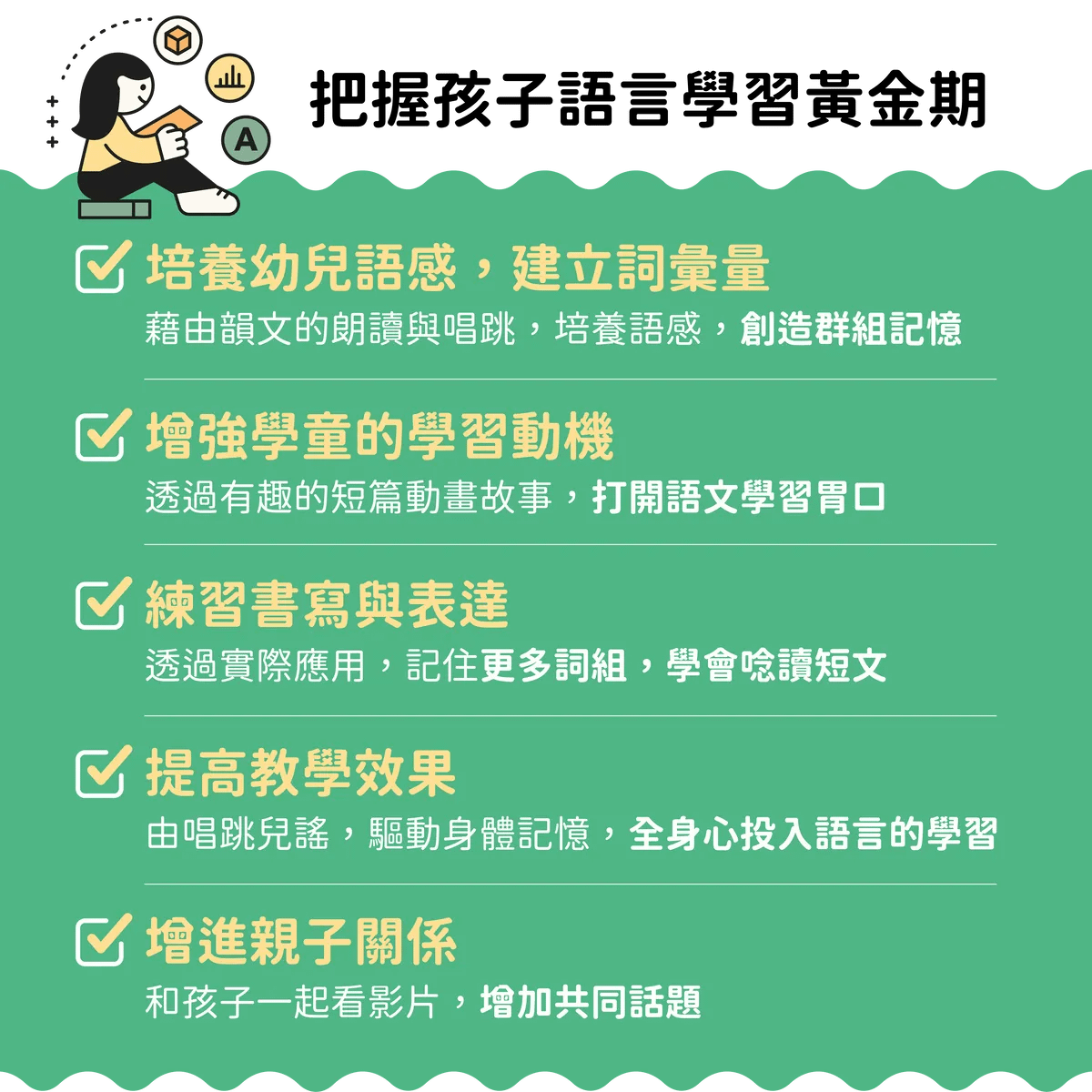 利用韻文自動生成注音符號的記憶,藉由唱跳注音兒謠與全身的肢體律動,驅動身體幫助語言記憶,在連結快樂的基礎下,讓孩子全身心投入學習與記憶。