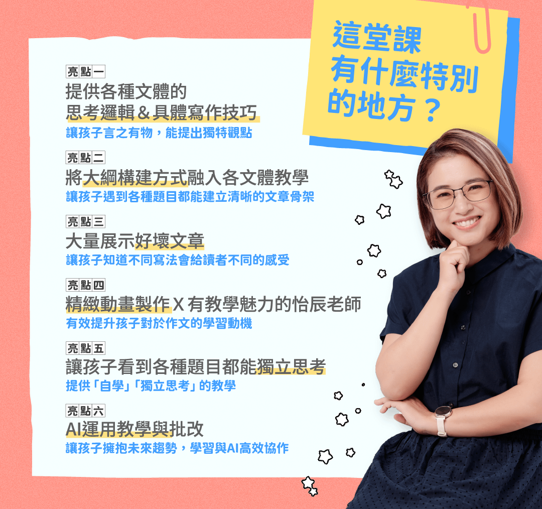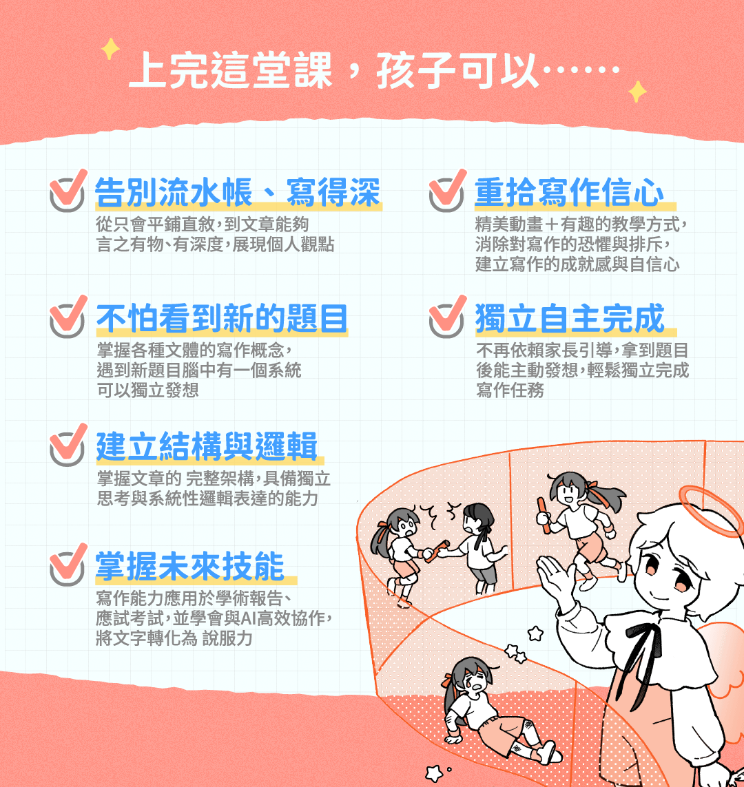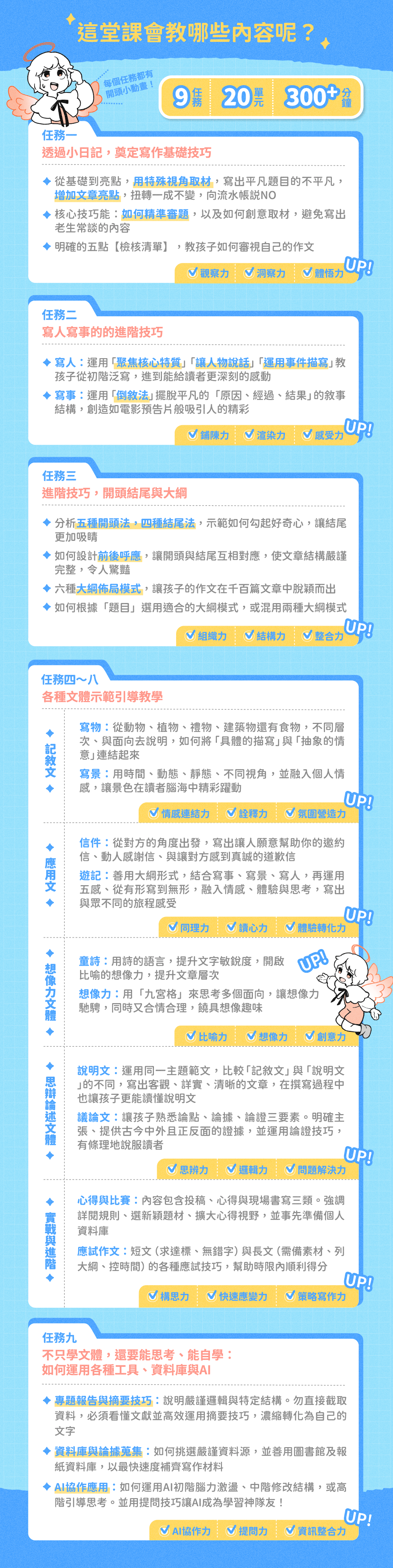 課程將抽象複雜的寫作,轉化為孩子能輕鬆上手的 9大任務、20 單元課程。