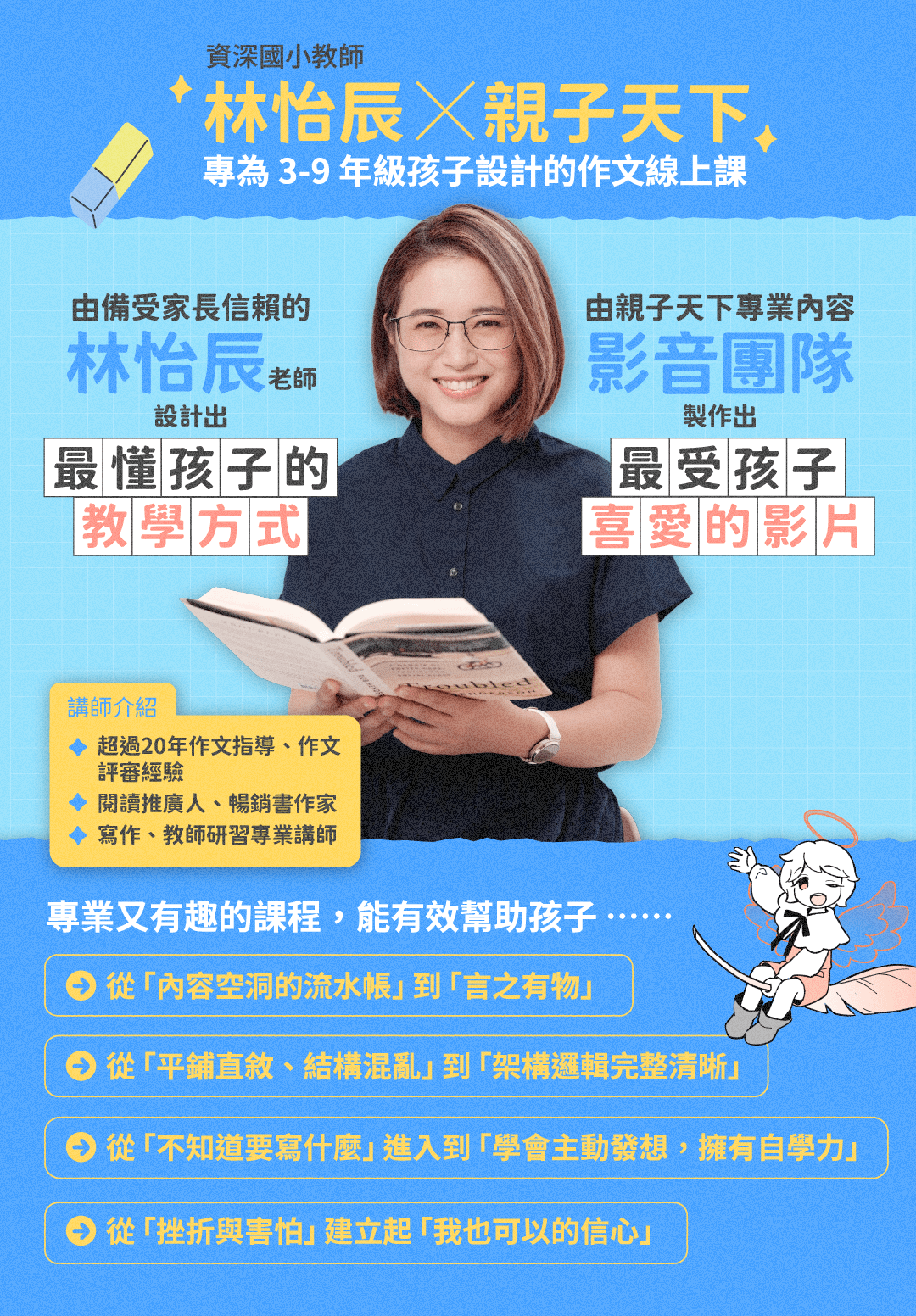 低年級剛開始學習寫作的孩子,建議從《林怡辰的線上作文課:4步驟讓孩子寫出高分作文》開始學習。