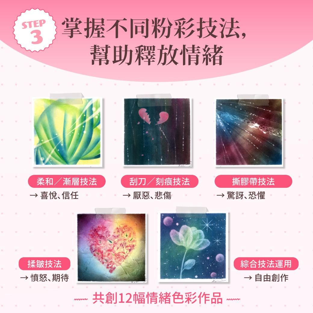 和諧粉彩課程結合「理論」與「粉彩畫技法」,每一單元都引導你學習一種情緒對應技巧,幫助你用和諧粉彩「畫出」內心感受。