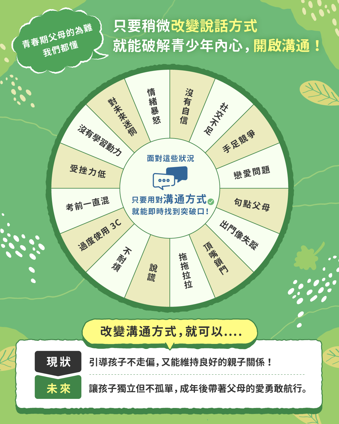 擅長演講主題:親職教育、情緒發展、親子溝通、親子教養、夫妻關係。已出版著作《對話中讓孩子感受愛》《讓孩子在情緒裡學會愛》、《陪伴你的力量》、《世界愈快,對孩子說話要愈慢》、《引導孩子說出內心話》等。