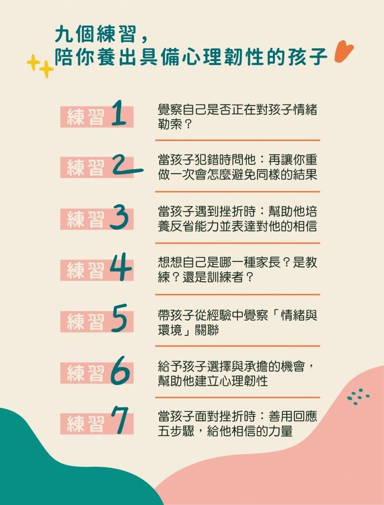 十堂課按照課程順序,搭配九個示範練習,循序漸進陪你養出,具備心理韌性的孩子。