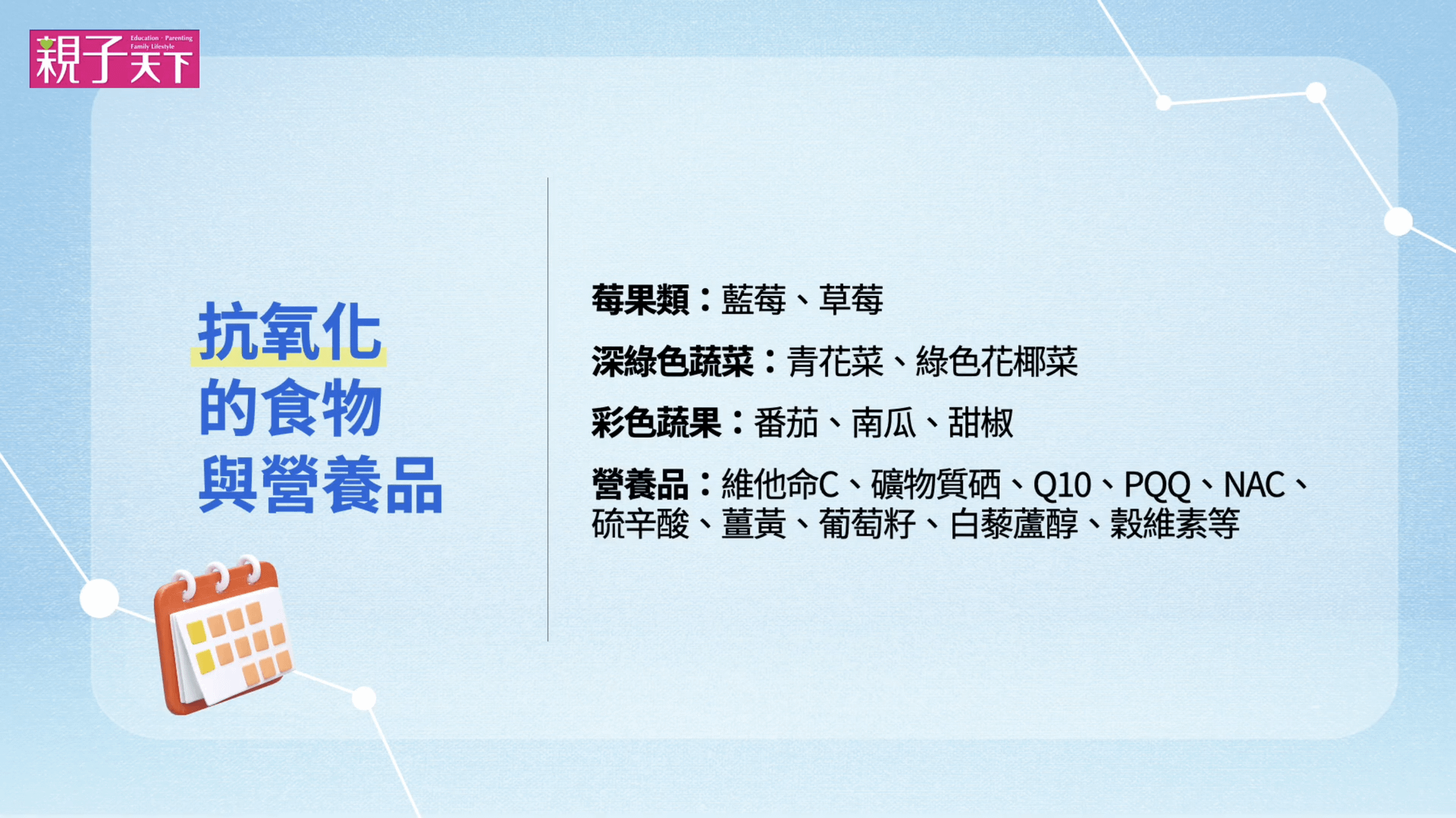 改善氧化壓力體質的重點是補充抗氧化劑,這些抗氧化劑能有效中和體內過多的自由基,減少對細胞的損害。富含抗氧化劑的食物包括各種顏色鮮豔的蔬菜水果,如藍莓、草莓、綠花椰菜、番茄等,這些食物能幫助孩子抵抗氧化壓力,保護大腦免受損害。