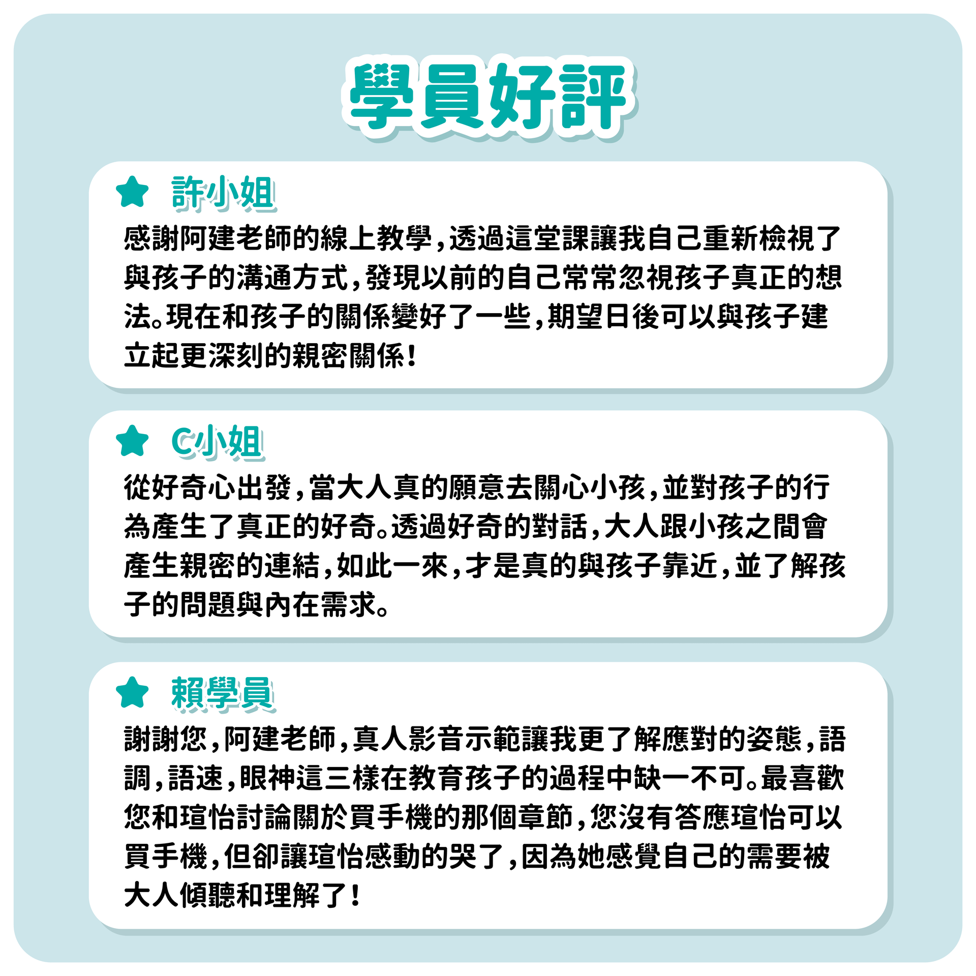 網路文章多半是精簡的、片面的,甚至有許多是經驗談。親子天下線上學校邀請教育、教養相關領域的專家,授課內容不但有豐厚的學理依據,還有實用的技巧與解方,加上親子天下長期深耕教育教養領域的專業度,絕對值得您信賴。