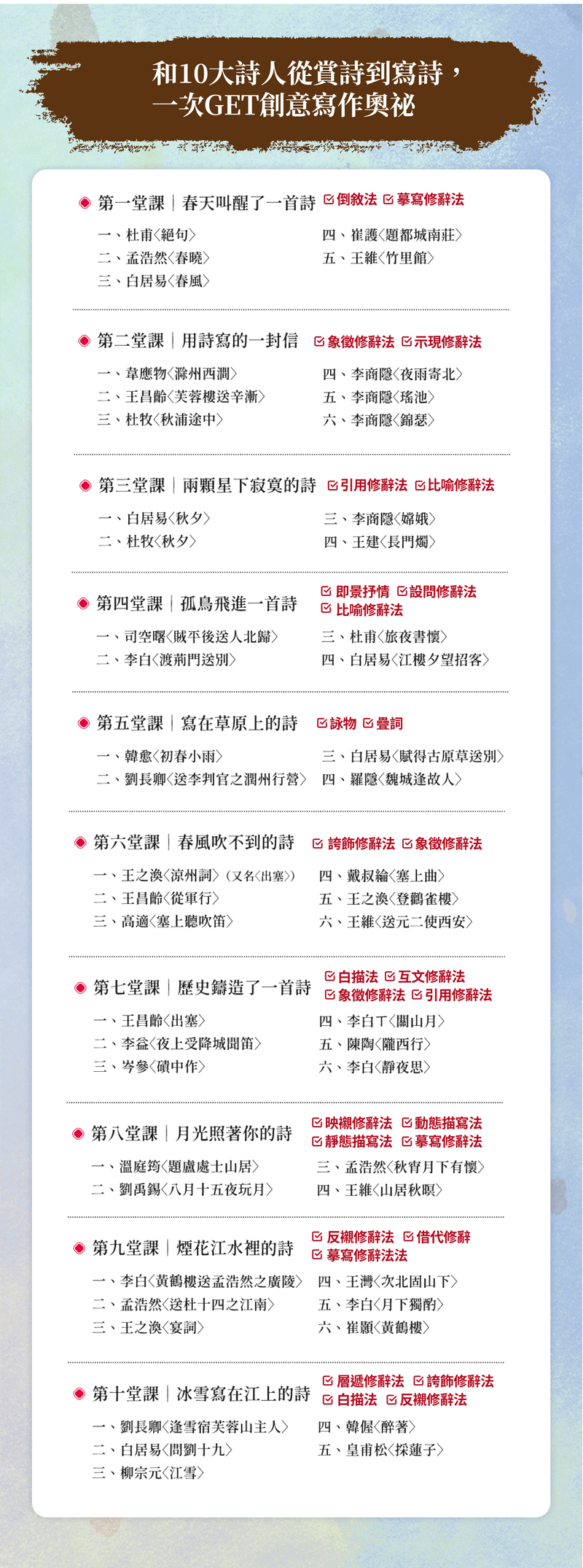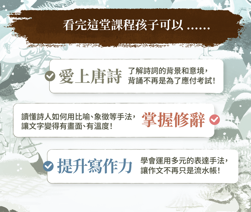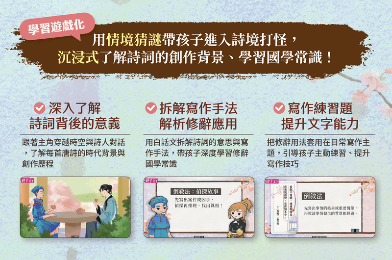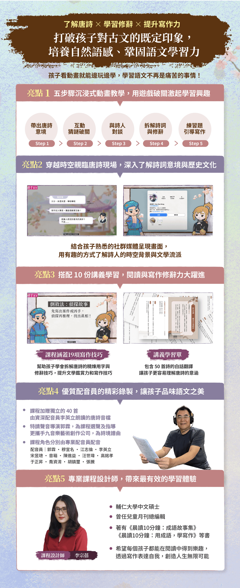 課程精選 50 首經典唐詩 深度賞析,並搭配 10 份學習單 與 50 首朗讀音檔,讓孩子在冒險故事中,自然看懂詩詞意境,還可以直接習得 19 種常見修辭的寫作技巧!