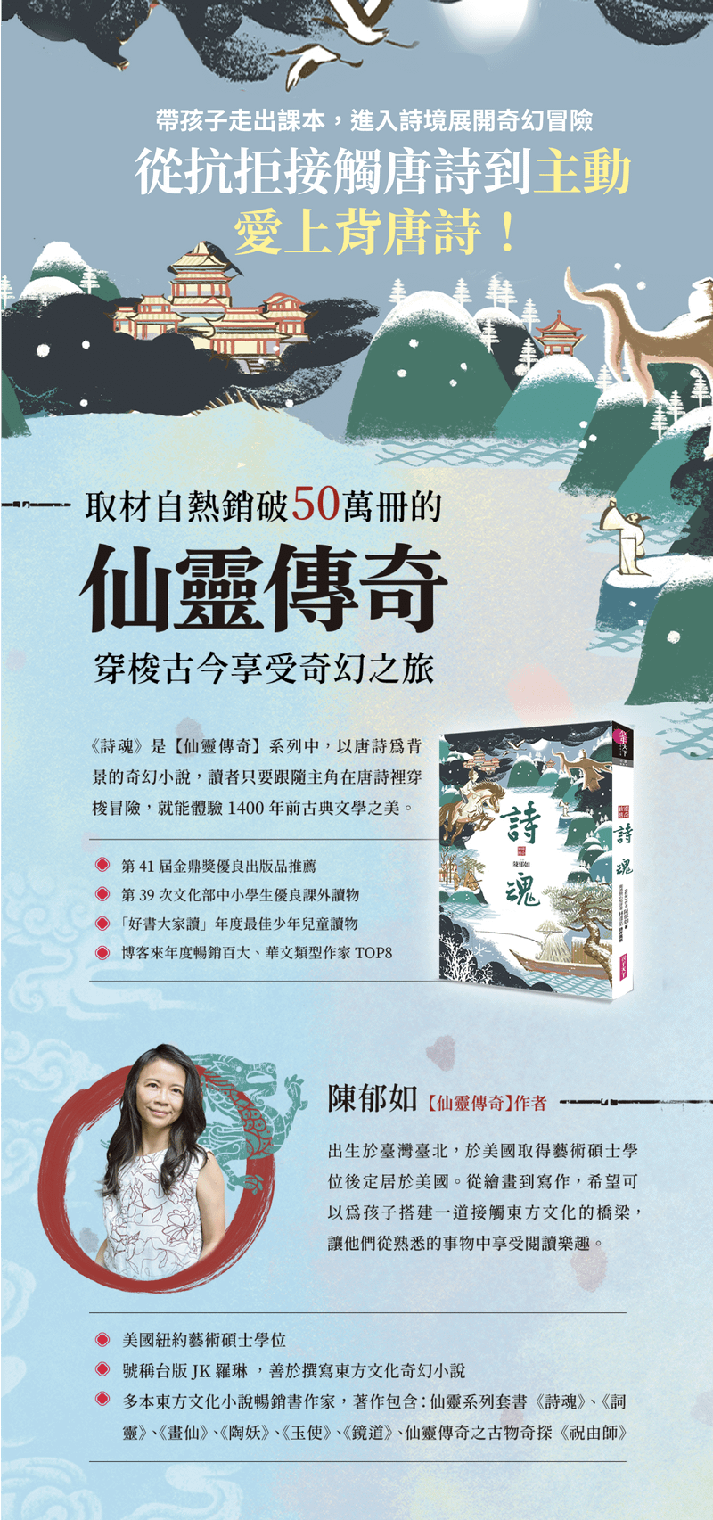 【仙靈傳奇之唐詩國學常識課】取材自暢銷破 50 萬冊的《仙靈傳奇—詩魂》,打造 沉浸式動畫國學常識課,透過 10 個單元課程 帶領孩子「穿越時空」,與李白、杜甫等傳奇詩人面對面,拆解千古名作背後的創作奧義。